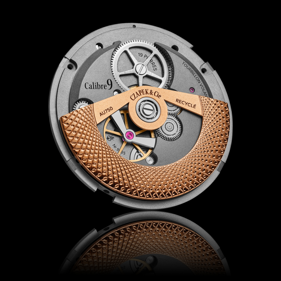 Reflecting Czapek’s unwavering pursuit of Beauty, the purity of the mechanism became the main design driver for the new in-house movement, Czapek Calibre 9. The fundamental principle was that that the three key elements – tourbillon, gear train and barrel – should be revealed on the dial side, perfectly aligned on the vertical axis and appearing as airy and light as possible. The open-worked flying tourbillon appears to hover between the main plate and dial, directly connected to the gear train, which floats in the centre of the dial beneath an extremely long and finely curved minutes bridge. The barrel dominates the upper section of the dial, floating in an aperture beneath an open-worked bridge.