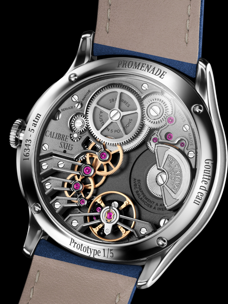 Since its introduction in May 2020, the automatic Calibre SXH5 has continually evolved. For Promenade, Czapek and its engineers played with its architecture purely for the sake of the dial aesthetics – another example of the Maison’s “Beauty above all” approach, positioning the small seconds mechanism now directly beneath, and on the same axis as the dial display.